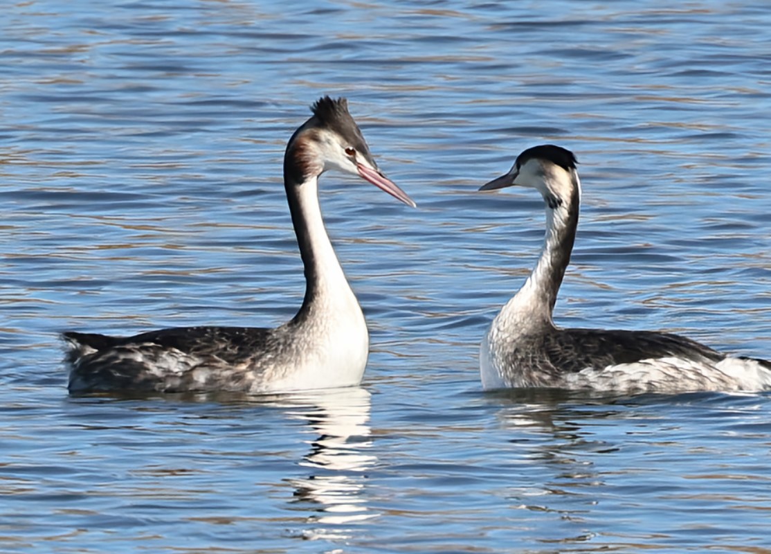 カンムリカイツブリ 2024.3.1 掲載、五十嵐川 遊水地で撮影、雌雄でしょうか ?