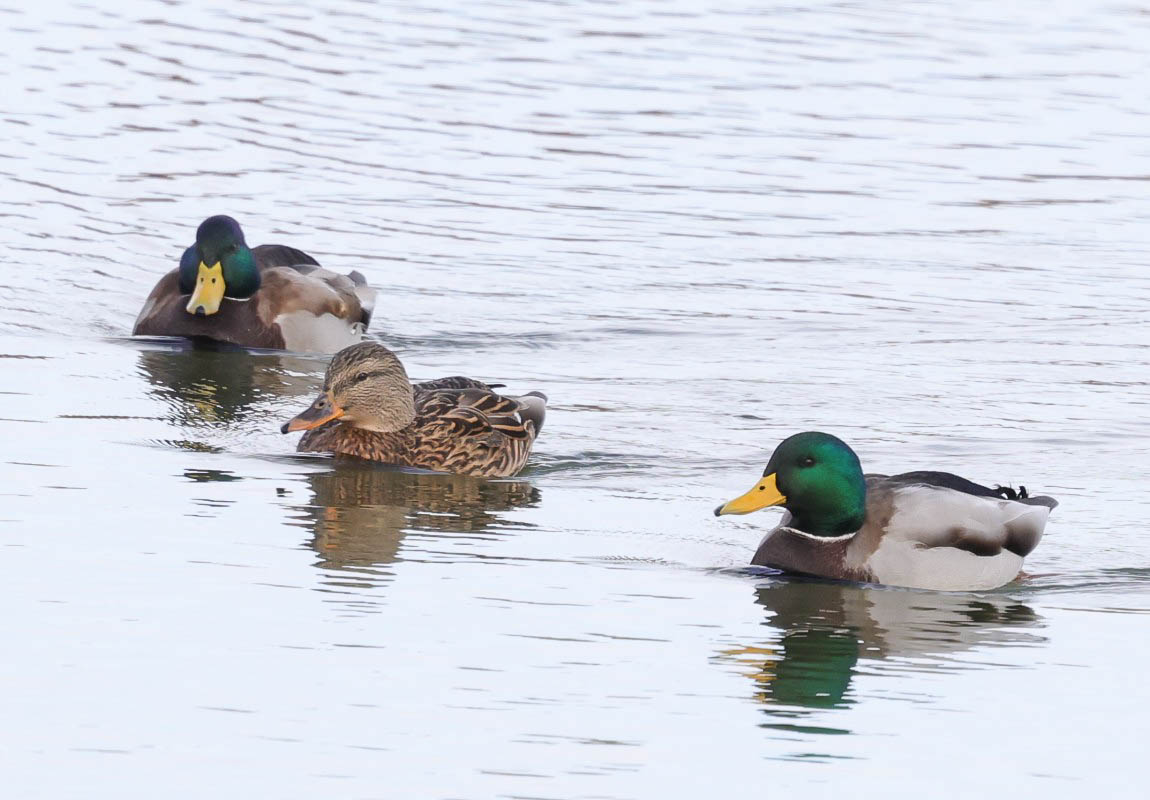 マガモ(オス、メス) 2026.1.2 掲載、五十嵐川 遊水地で撮影