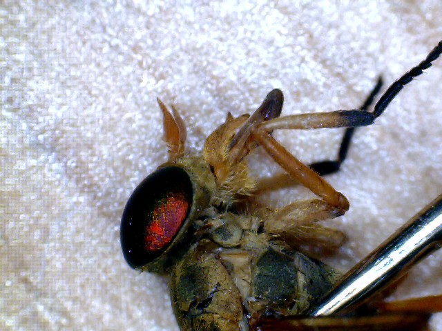 ヤマトアブ ? 2013.8.11 付近の山で撮影 体長 20mm程、(本によれば17−23mm)、触角 第3節基部背面に顕著な突起あり、シロフアブはなし、ウシアブは 体長 23−28mm、私には良く区別が付きませんが、体長からしてヤマトアブとしました? 分布 日本全土 |