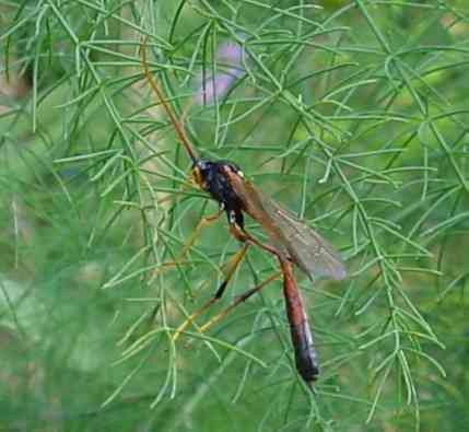 2006.5.22 撮影。長い産卵管がありメスでしょうか。 カミキリムシの幼虫に産卵するようです