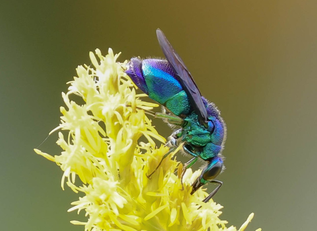2013.8.31 佐潟で撮影、ヤブガラシの花を次から次ぎへと飛び回っておりました。幼虫は親が用意した キリギリスなどの虫をエサとして育つようです。分布 ほぼ日本全土、6−8月に活動、体長 23−33mm、巣は地中に作る。