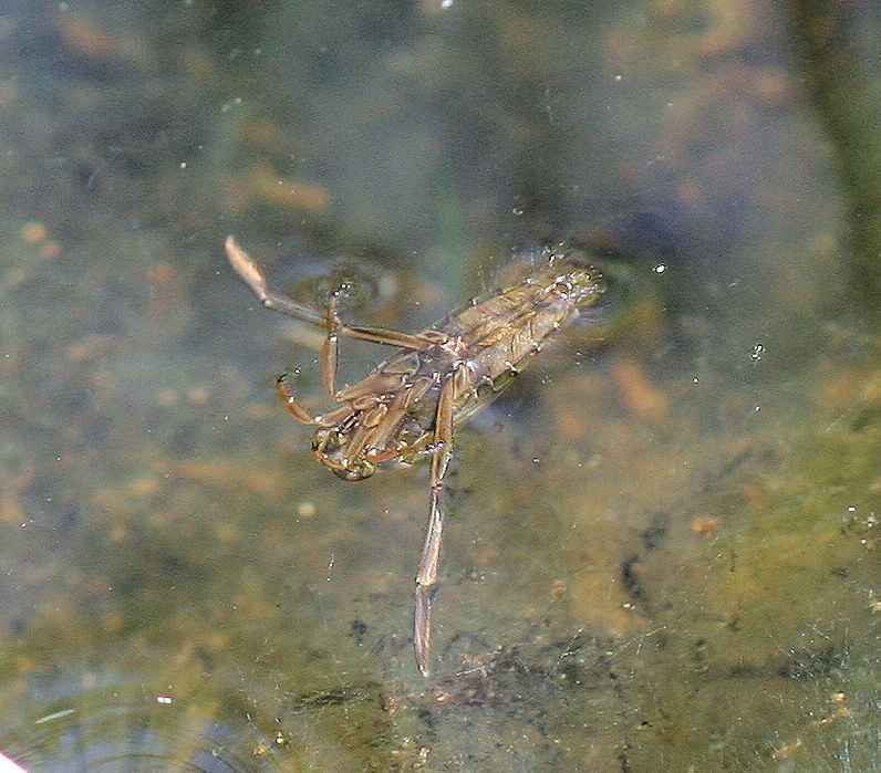 マツモムシ 2007.8.31 付近の山の湿地でハッチョウトンボを追いかけている時に見かけました。 撮影している時は気が付かなかったのですが,画像を整理していたら,腹が上を向いておりました。獲物を捕るのに都合がよいのでしょうか |
