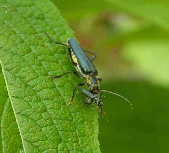 アオカミキリモドキ2004.5.25 庭で撮影。分布 日本全土, カンタリジンによる接触皮膚炎を起こす事があるようです |
